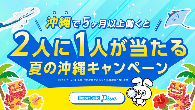 リゾートバイト求人数No.1のダイブ、『2人に1人が当たる夏の沖縄キャンペーン』を開始!沖縄で5ヶ月以上のリゾートバイトをスタートすると、2人に1人の確率で現金10万円またはプレゼントが当たる!