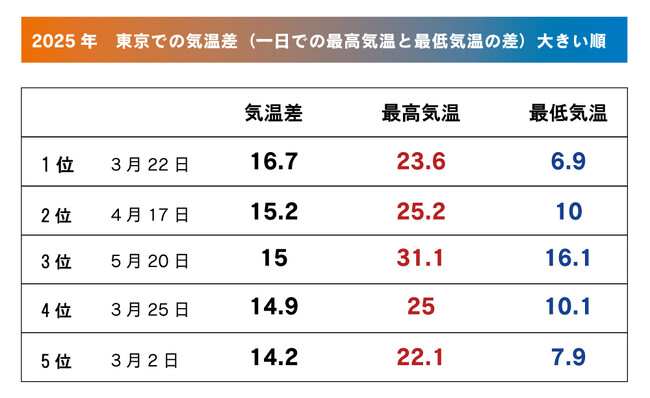 季節の変わり目は、1日の中で気温差が大きくなりやすい季節です。 気象庁の観測でも、春や秋は朝晩と日中で10℃以上の寒暖差が発生する日が多く、体温調整の難しさや服装選びに悩む人も少なくありません。