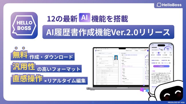 次世代オンラインサービスを開発・運営する株式会社NGA(本社:東京都港区、CEO:Alex Wang、以下「NGA」)が提供している第3世代AI採用サービス『HelloBoss』はこのたび、書類選考に強い履歴書を最短5分で無料作成できるAI履歴書作成機能Ver.2.0を発表しました。本機能では、履歴書作成に最適化されたAIモデルを採用し、直感的な操作によるスムーズでスマートな履歴書作成体験を実現しました。高精度な自動文章作成やアピールポイントの自動解析・提案など、履歴書作成を効率化する12の最新AI機能を搭載しています。はじめての就職や転職の方、また多忙な方や文章力に自信がない方でも、本来のスキルや強みを的確に反映した高品質な履歴書をスピーディに作成できるようサポートし、求職者が新しい人生の一歩を踏み出すことを支援します。