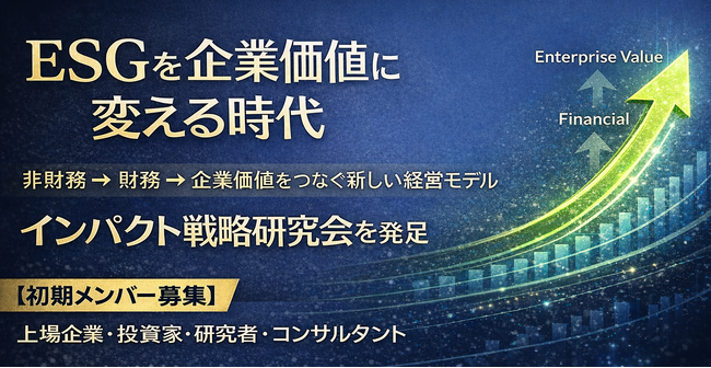 研究会の取り組みの一環として「インパクト企業価値戦略セミナー 第1回」を開催します。本セミナーではESGを企業価値に変換する実践フレームワークを解説します。
