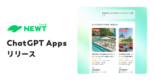 株式会社令和トラベル(本社:東京都渋谷区、代表取締役:篠塚 孝哉)が運営する、かしこい、おトク、旅行アプリ『NEWT(ニュート)』は、OpenAIの対話型AI「ChatGPT」の新機能「Apps in ChatGPT」へのアプリ連携を開始しました。これにより、カスタマーはChatGPTとの対話を通じて旅行の希望やイメージを伝えるだけで、自分に合った海外ツアーを探すことが可能になります。なお、日本国内の旅行サービスにおいて、同機能を通じた海外ツアー検索に対応するのはNEWTが初めてです。
