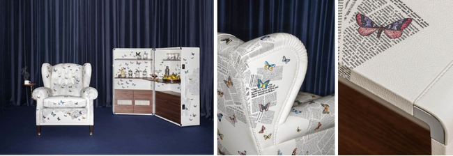 本コラボレーションでは、ポルトローナ・フラウの歴史を象徴するアームチェア「1919」とトランク型ドリンクキャビネット「Isidoro(イシドロ)」という2つのアイコニックなプロダクトを、フォルナセッティを象徴するモチーフとして知られる「Ultime Notizie(ウルティメ・ノティツィエ)」で再解釈しました。