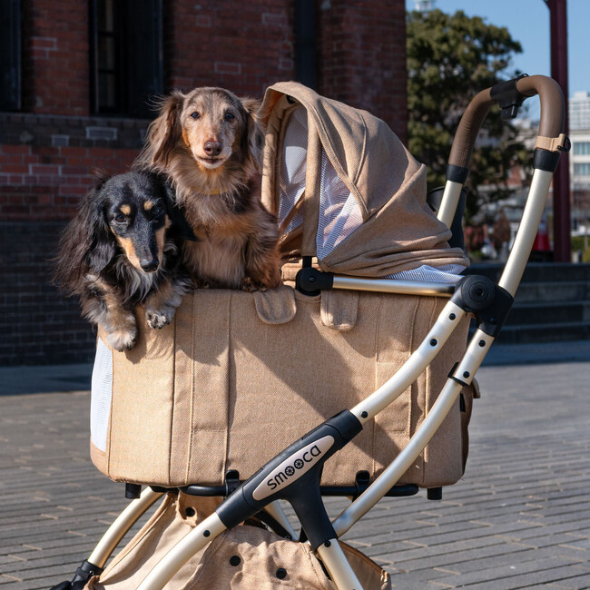 「スムーカ」は、スムーズで快適な移動を追求する、当社オリジナルのペットカートブランドです。ペットが安心して過ごせる“お家のような空間”を外出先でも実現することを目指し、ペットの不安やストレスを和らげつつ、ペットとオーナーが同じ目線で景色を楽しめる移動手段として誕生しました。移動時間そのものを「心地よい思い出」に変えていきます。