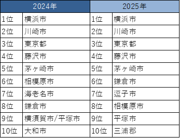 ■都市別ランキング上位5つは昨年と変化がなく、前回ランク外だった逗子市が7位にランクインした。