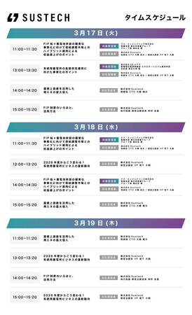 本展示では、Sustechによる電力市場の最新動向などの解説セミナーと、パートナー企業様として、テス・エンジニアリング株式会社様及び株式会社GSユアサ様の専門担当者をお招きした特別対談セミナーを実施します。