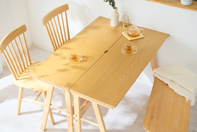 テーブル奥行きは40cmと一般的なダイニングテーブルよりコンパクト。壁付けデスクやキッチンカウンター沿いにも設置でき、ワンルームや書斎などスペースが限られた住環境でも圧迫感なく使用できます。