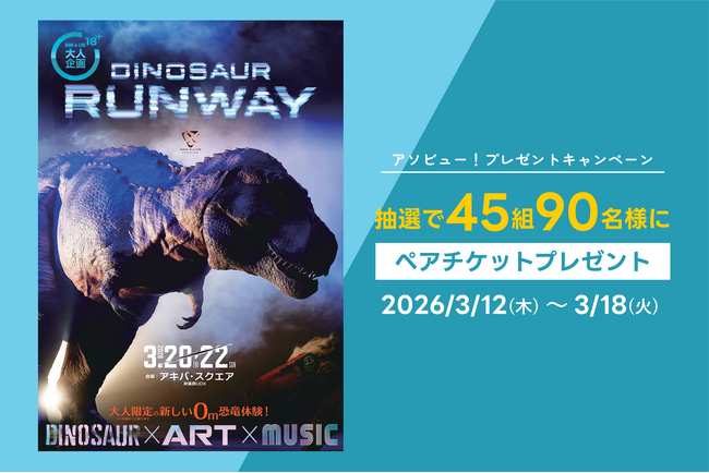 休日の便利でお得な遊び予約サービス「アソビュー!」(URL:https://app.adjust.com/138x1dst、以下:アソビュー!)を運営するアソビュー株式会社(所在地:東京都品川区、代表執行役員CEO:山野智久、以下:当社)は、「DINOSAUR RUNWAY <ペアチケット>」が抽選で45組90名様に当たるプレゼントキャンペーンを、2026年3月12日(木)より開始します。