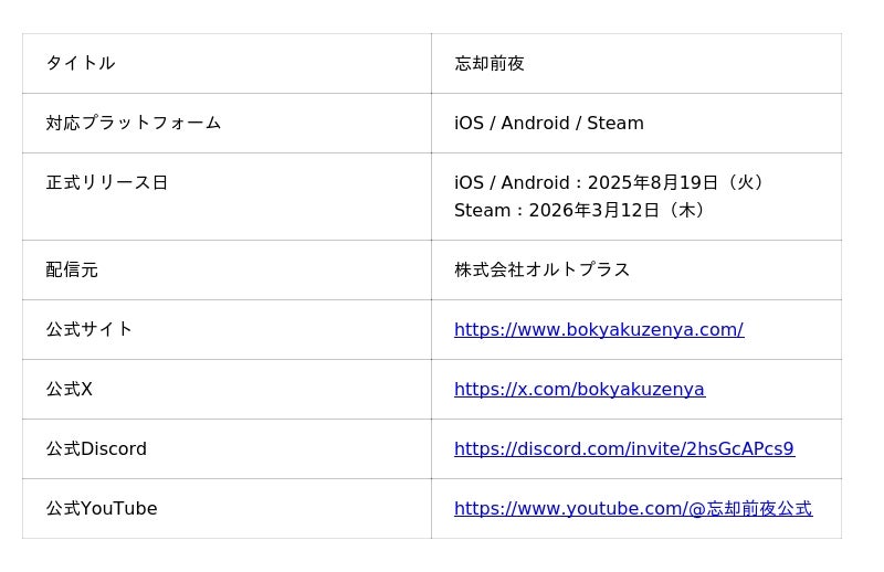 株式会社オルトプラス(本社:東京都豊島区、代表取締役:石井 武、以下「オルトプラス」)は、本日2026年3月12日(木)より、Steam版『忘却前夜』の配信を開始いたしましたことをお知らせいたします。