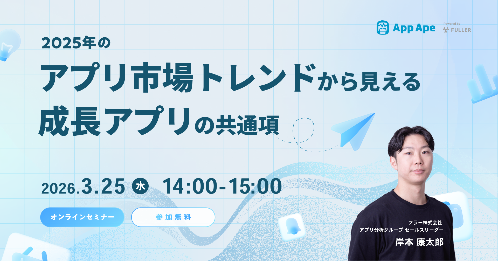 アプリ市場分析サービス「App Ape(アップ・エイプ)」を手がけるフラー株式会社(本社:新潟県新潟市、代表取締役社長:山崎将司、以下「フラー」)は、最新のアプリ市場データをもとにトレンドや成長アプリの特徴、データ活用のポイントを解説するオンラインセミナー「2025年のアプリ市場トレンドから見える成長アプリの共通項」を2026年3月25日(水)に開催します。