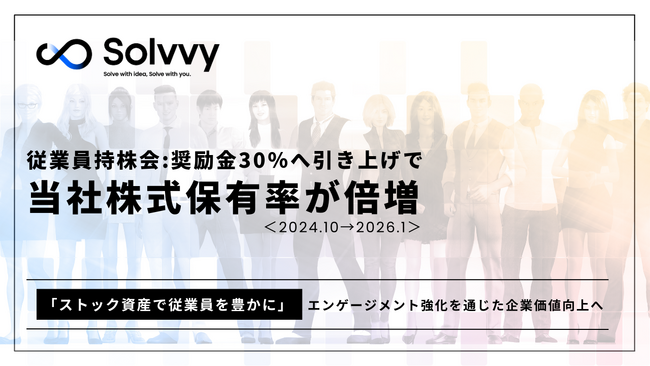 Solvvy株式会社(本社:東京都、代表取締役:安達慶高、以下「当社」)は2025年7月に人的資本投資の一環として、Solvvy従業員持株会制度における積立額に対する奨励金付与率を30%へと引き上げたことで、対象従業員*¹に占める当社株式保有率が、約4割に倍増*²したことをお知らせします。