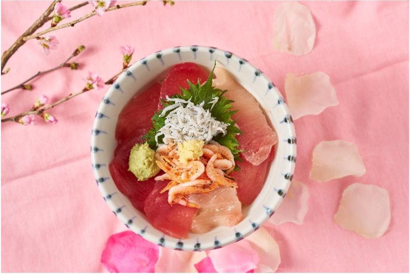 キハダマグロとビンチョウマグロ、しらすと桜えびで春の感じを紅白の彩りで仕上げた丼ぶりです。