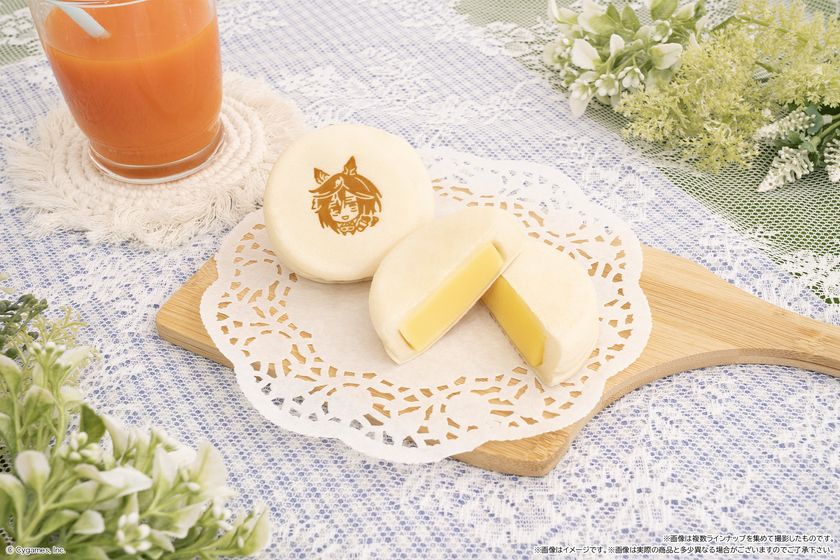白いもちもちの今川焼きに、ゲーム『ウマ娘 プリティーダービー』に登場するキャラクターの焼き印を施したチルドスイーツです。焼き印デザインは全部で6種類。白色の生地の中には、カスタード味のクリームが入っています。