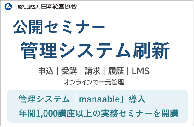一般社団法人日本経営協会(本部事務局:東京都渋谷区、会長:高原 豪久)は、公開セミナー事業において、受講者および組織のセミナー担当者の利便性向上を目的に、セミナー申込から受講、請求管理までをオンラインで一元管理できる新システム「manaable(マナブル)」を2026年3月6日に導入いたしました。2026年4月開講のセミナーより順次利用を開始いたします。