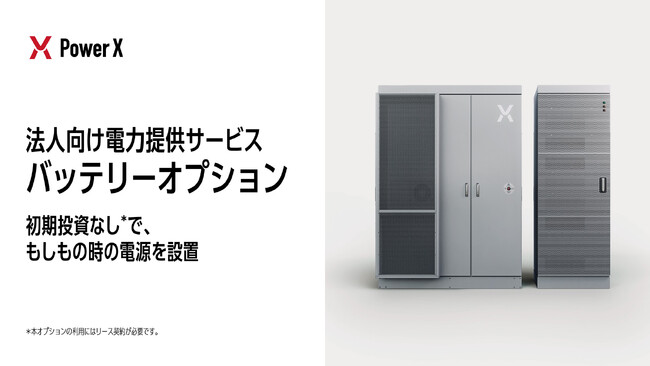 株式会社パワーエックス(本社:岡山県玉野市、取締役 代表執行役社長CEO:伊藤 正裕、証券コード:485A)は、法人向け電力供給サービスの新たなオプションとして、当社の蓄電システムを初期投資実質0円*1で導入できる「バッテリーオプション」(以下「本オプション」)の提供を本日より開始いたします。