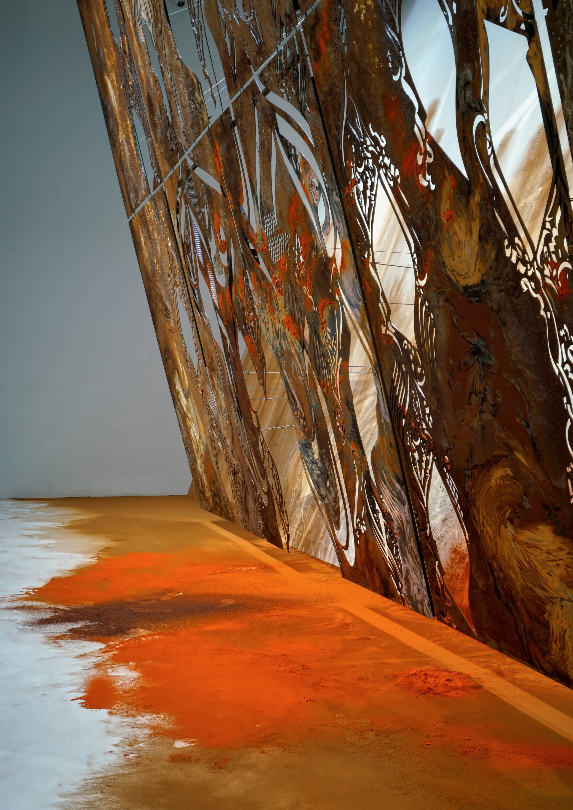 この展覧会は、モニア・ベン・ハムーダによるFragments of Fire Worship (火礼拝の断片)で幕を開けます。これは、ヴェスティボーロ(玄関ホール)に設置された2つのネオンの彫刻で構成されるインスタレーションです。断片化され解読不能な光のサインは、その伝達機能を放棄し、ジェスチャー、痕跡、傷跡となった文字形態を想起させます。イスラム書道家の娘であるアーティスト モニアは、自身の文化遺産を解読不能なアルファベットへと変容させ、光は照らす代わりに隠蔽しています。ネオンは、明らかにすると同時に破壊する両義的な力として捉えられた火を想起させ、それは知識を不安定な物質として絶え間ない変容にさらされるもの、という視点で提示します。形式的な不服従の実践を通して、この作品は知識伝達の単義的な媒体としての言語概念に挑みます。
