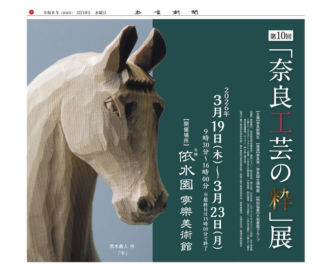 奈良新聞社は、3月19日から5日間の日程で開催する第10回「奈良工芸の粋」展を特集したタブロイド判ガイド紙(ミニ新聞)を、3月18日に発行いたします。