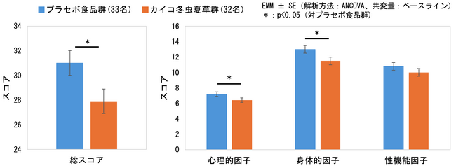 臨床試験の結果、カイコ冬虫夏草を摂取することで、AMSスコア※1の総スコアに加え、下位項目である心理的因子および身体的因子においても、統計学的に有意な改善が認められました。これらの知見から、男性更年期症状の改善に寄与することが確認されました。