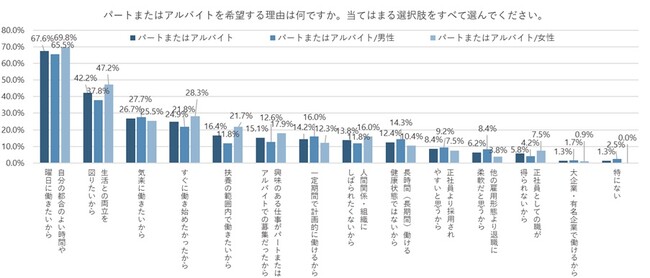 パート・アルバイトを希望する理由は「自分の都合のよい時間や曜日に働きたいから」が67.6%で最多。約半数が土日の勤務を希望しない