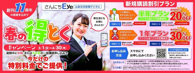 山梨日日新聞デジタル「さんにちEye」はいま、「春の得とくキャンペーン」を実施中。新規の期間購読申込で大幅割引が受けられます。