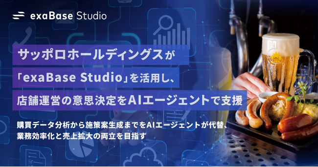 株式会社エクサウィザーズ(本社:東京都港区、代表取締役社長CEO:春田 真、以下エクサウィザーズ)は、サッポロホールディングス株式会社(以下サッポロホールディングス)が実施する、AIエージェント開発・運用プラットフォーム「exaBase Studio」を活用した購買データ分析を支援してきました。その結果として、AIエージェントが生成した施策のテスト展開が開始されることをお知らせします。サッポロホールディングスは、店舗運営における購買データ分析から施策案生成までをAIエージェントが代替することで、業務効率化と売上拡大の両立を目指し、エクサウィザーズはそれを支援します。本施策はグループ企業である(株)サッポロライオンの銀座ライオン渋谷マークシティ店において3月16日より実施されます。