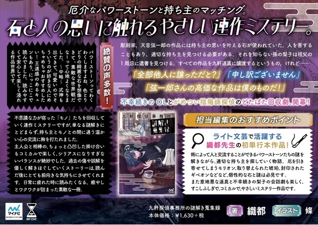 株式会社マイナビ出版(本社:東京都千代田区、代表取締役 社長執行役員:角竹輝紀)はこのたび、『九軒探偵事務所の謎解き蒐集録』を2026年3月16日(月)に発売します。主人公の祖父が残した“喋る”彫刻作品『枝狼』とがめつい陰陽師探偵とともに、特別な石が使われている彫刻作品をめぐる、コミカルなミステリー作品です。