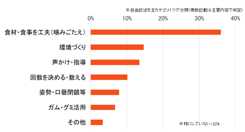 また、本プログラムは、学校現場からの満足度が高いだけでなく、保護者の多くが「食材・食事の工夫」や「ゆっくり食べる環境づくり」など、家庭での行動変容にもつながったと回答しており、学校から家庭へと“噛む習慣”づくりが広がっていく様子がうかがえました。