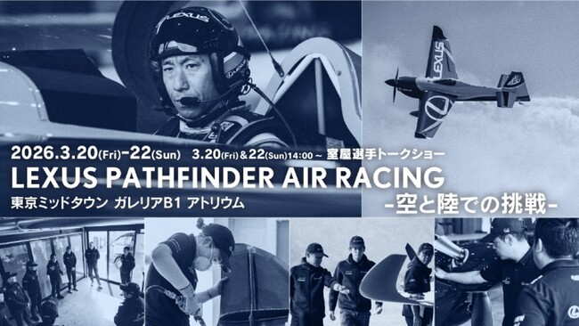 LEXUSとエアレース・パイロット室屋義秀選手が、空と陸の境界線を越えて共創活動をしているエアレースチーム「LEXUS PATHFINDER AIR RACING」は、2026年3月20日(金)~22日(日)の3日間 「LEXUS PATHFINDER AIR RACING -空と陸での挑戦-」を東京ミッドタウン(六本木)ガレリアB1アトリウム イベントスペースにて開催します。