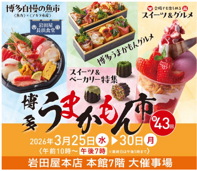 福岡商工会議所(博多うまかもん市実行委員会)は、福岡を代表するふるさとの味や名店が一堂に会する物産展「第43回 博多うまかもん市」を、2026年3月25日(水)から30日(月)まで、岩田屋本店 本館7階大催事場にて開催します。