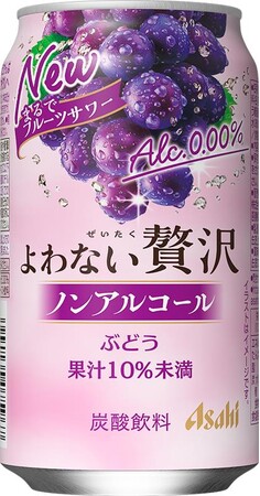『アサヒよわない贅沢ぶどう』は、ぶどうの華やかな香りと上品な果実の甘みが楽しめるアルコール分0.00%のノンアルコールカクテルテイスト飲料です。パッケージは、ぶどうのイラストを大きく描き、果実の味わいを表現しています。また「まるでフルーツサワー」と「ノンアルコール」と記載し、酔わずにフルーツサワーのような味わいが楽しめる魅力を訴求しています。