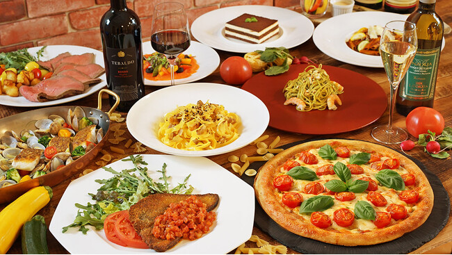 焼きたて窯焼きピザ、パスタ、アクアパッツァ、カルパッチョ、カプレーゼにラザニアまで前菜からドルチェまで揃う、春のイタリアンフェア!イタリアの“おいしい”をテーブルいっぱいにどうぞ。