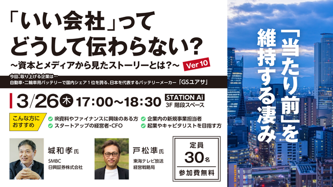 東海テレビ放送株式会社(本社:名古屋市東区)は、2026年3月26日(木)にSTATION Ai(愛知県名古屋市昭和区鶴舞1丁目2番32号)にて、SMBC日興証券株式会社とのコラボイベント【「いい会社」ってどうして伝わらない?~資本とメディアから見たストーリーとは?~】第10弾を開催いたします。