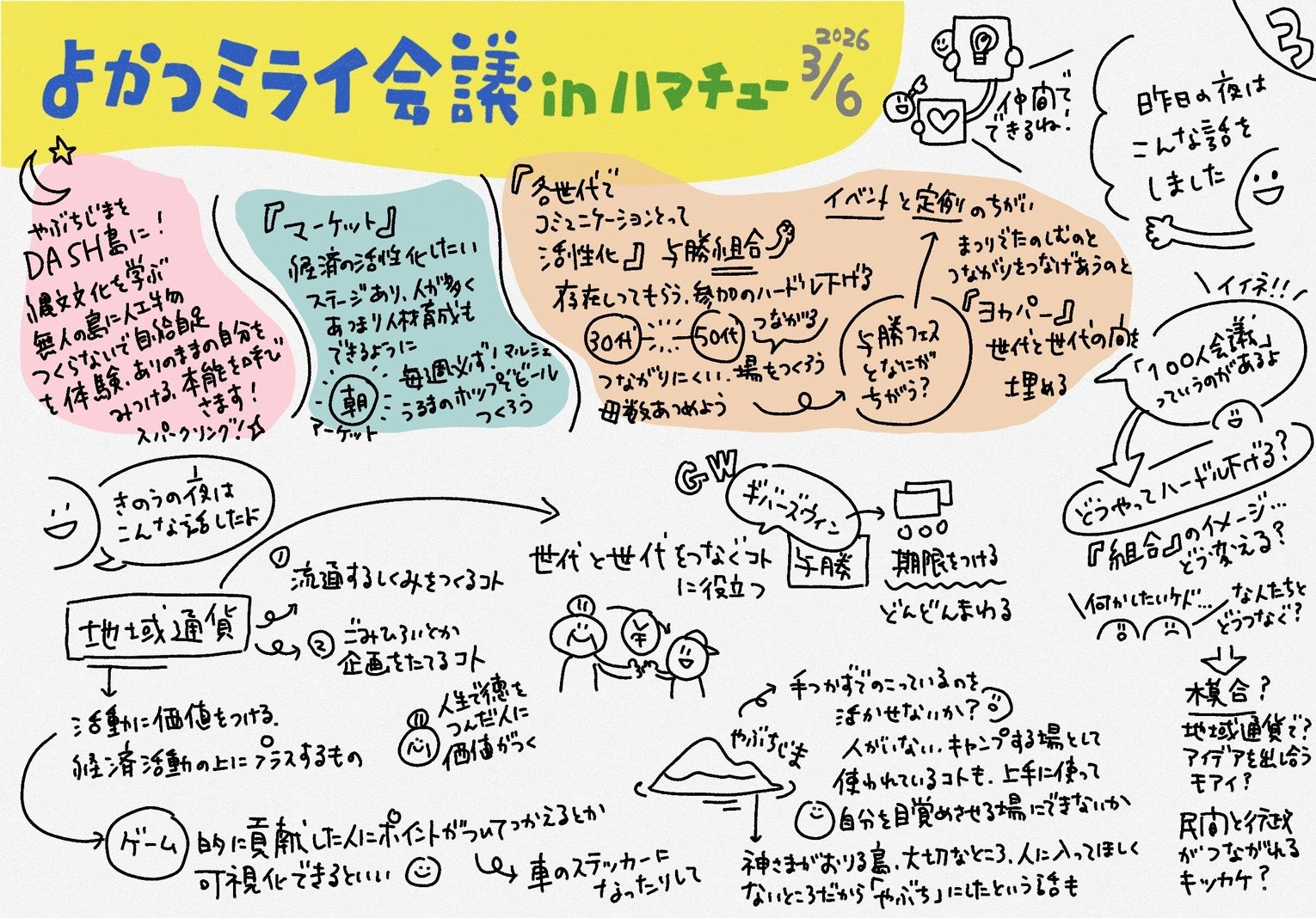 本会議で生まれたプロジェクトの主役は参加者自身です。HAMACHŪは、参加者が自律的に「次、これやろう!」と一歩を踏み出すための「装置(きっかけ)」として機能します。