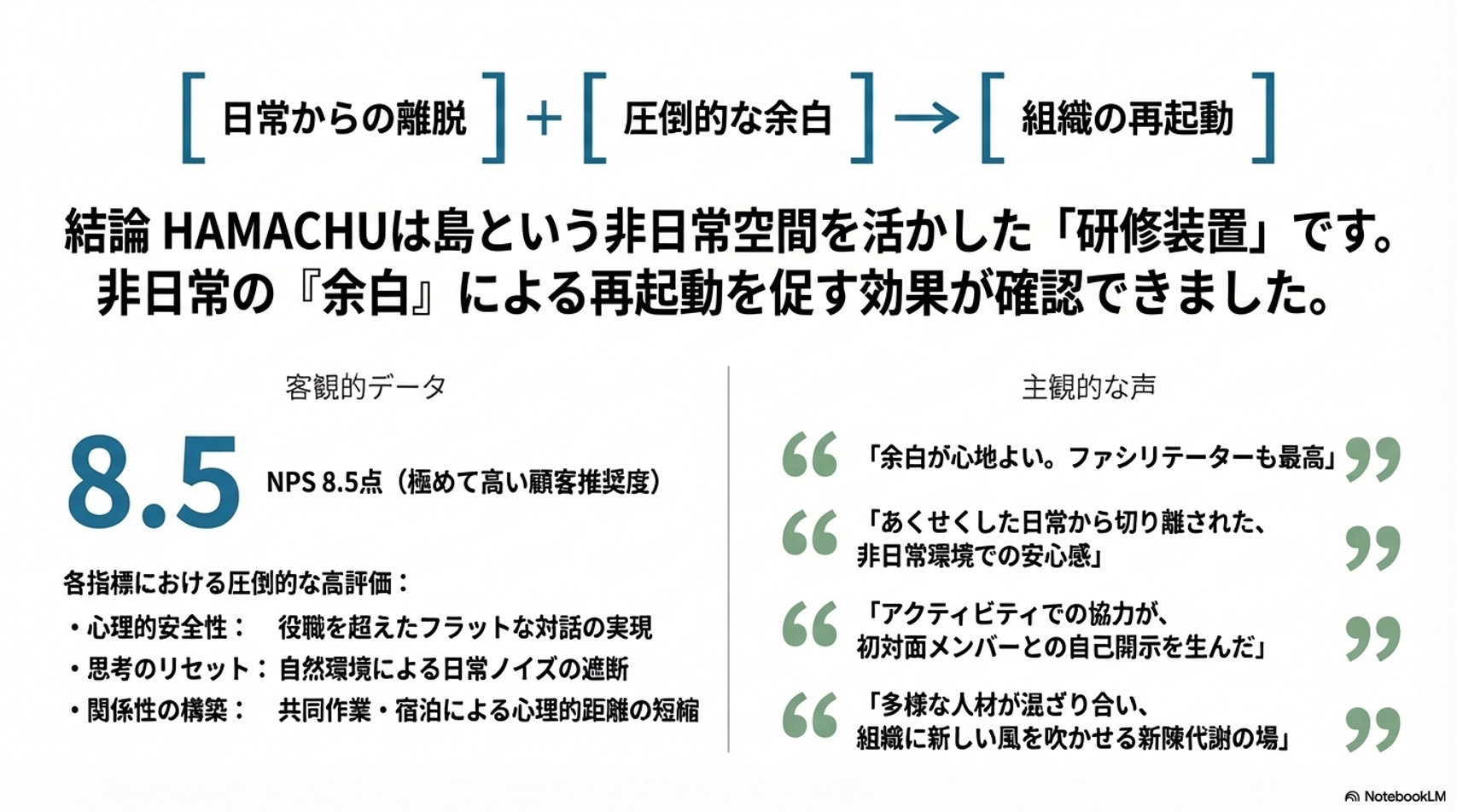 - 「非日常の余白」がもたらす効果: 心理的安全性や思考のリセットといった全項目で最高評価を記録。「余白があるからこそ本音が言える」というHAMACHŪ独自の価値が証明されました。