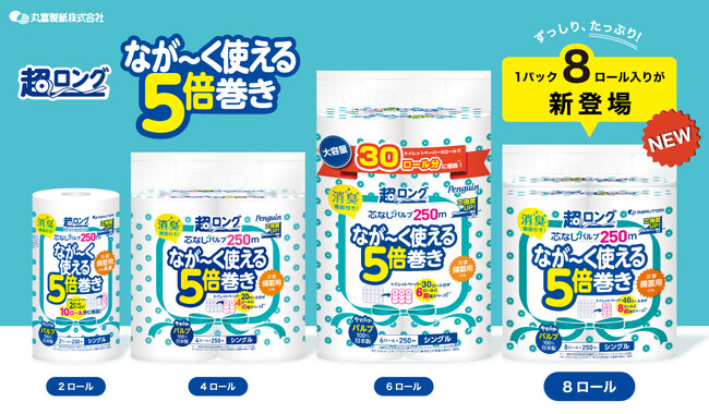 たっぷり安心ストック!ペンギン超ロング5倍巻きシリーズに8ロールタイプが新登場!