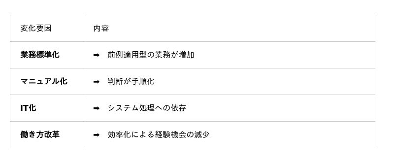 つまり企業では、判断が重要になる一方で、判断経験は減少しているという構造が生まれている可能性があります。