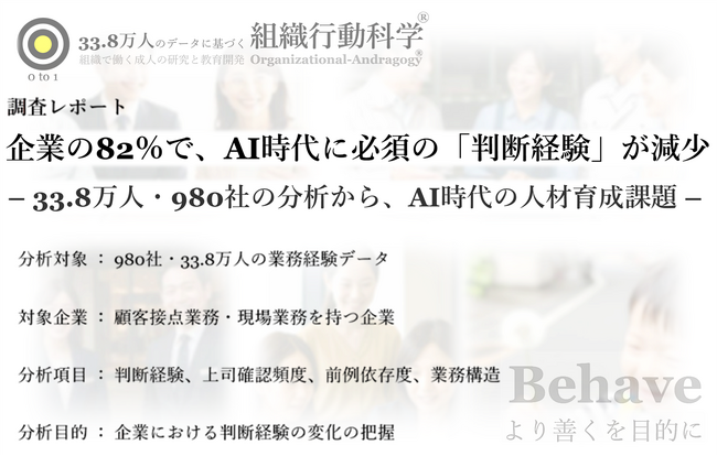 調査レポート公開:企業の82%で、AI時代に必須の「判断経験」が減少。33.8万人・980社の分析から、AI時代の人材育成課題を公開(組織行動科学(R))