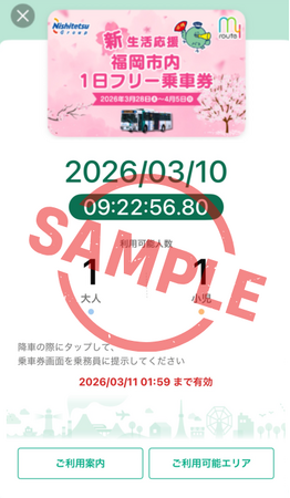 【概要】期間限定で、「my route」内で使用できる『西鉄バス 福岡市内1日フリー乗車券』を300円で販売するもの。