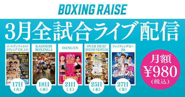 ボクシングライブ配信サービス「BOXINGRAISE」は、2026年3月17日(火)から3月27日(金)にかけて、5つのボクシングイベントを全試合ライブ配信いたします。