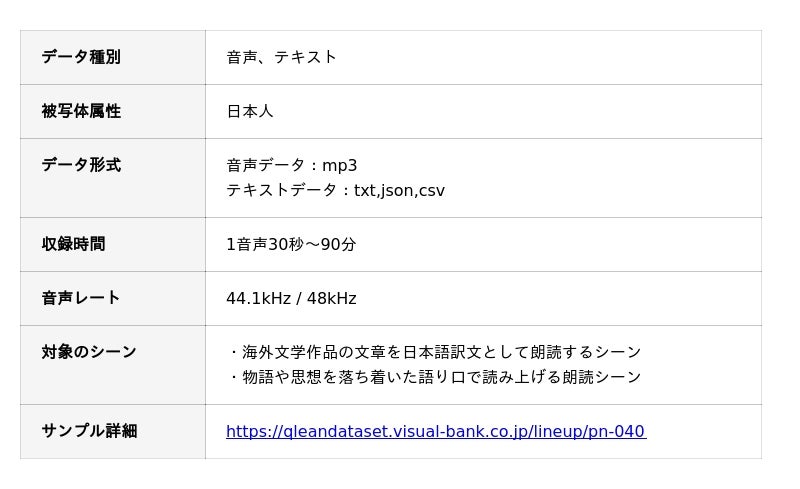 Visual Bank株式会社(東京都港区、代表取締役CEO 永井真之)は、傘下の株式会社アマナイメージズを通じて展開するAI学習用データソリューション「Qlean Dataset(キュリンデータセット)」において、音声認識(ASR)精度の向上や、自然な韻律を持つ音声合成(TTS)モデルの学習に最適化された、「海外文学の朗読音声とトランスクリプト」の提供を開始します。