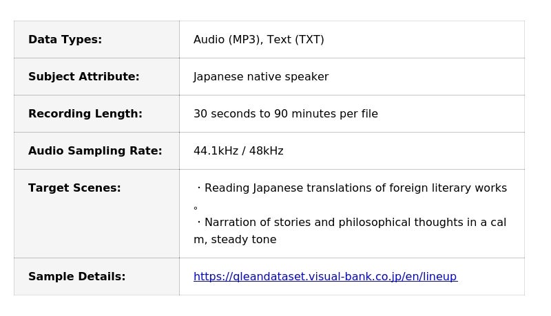 Visual Bank Inc. (Minato-ku, Tokyo; Saneyuki Nagai, Representative Director and CEO), through its subsidiary amana images inc., is pleased to announce the release of the "Japanese Reading Corpus of Foreign Literature" under its AI training data solution, Qlean Dataset. This dataset is specifically optimized for improving Automatic Speech Recognition (ASR) accuracy and training Text-to-Speech (TTS) models with natural prosody.