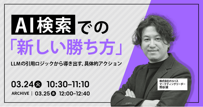 SEO/LLMOツール「パスカル」の開発・提供を行う株式会社オロパスは、2026年3月24日(火)に、AI検索の急速な普及に伴う、今後のWeb集客の変化をテーマにしたウェビナー、『AI検索での「新しい勝ち方」~LLMの引用ロジックから導き出す、具体的アクション~』を開催いたします。