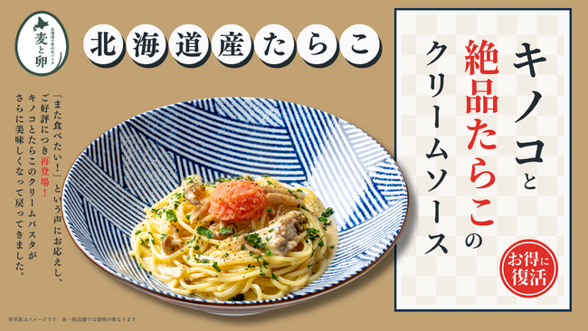 札幌を中心に東北・関東で「北海道イタリアンミア・ボッカ」「焼鳥ダイニング いただきコッコちゃん」など45店舗を経営する株式会社イーストン(所在地:札幌市北区、代表取締役社長:大山 泰正、以下「イーストン」)は、北海道小麦の生パスタ専門店 「麦と卵」にて、前回販売時に圧倒的な支持をいただいた『キノコと絶品たらこのクリームソース』を、お客様からの熱い再販リクエストにお応えし、2026年3月18日(水)から販売いたします。