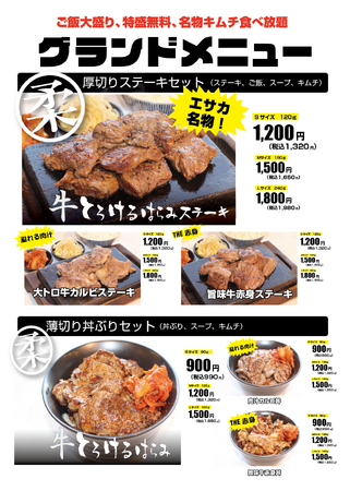 肉のエサカでも人気メニューである「とろけるハラミ」「大トロビーフステーキ」「旨味牛赤身ステーキ」が1000円で食べて頂くことができます。しかも、ご飯の大盛・特盛は無料、キムチに関しては食べ放題です。