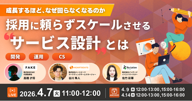 コミュニケーションプラットフォ-ム「Re:lation(リレーション)」を提供し、6,000社以上(※1)の導入実績を誇る株式会社インゲージ(本社:大阪府大阪市、代表取締役社長:和田 哲也)は、株式会社ハートビーツ、株式会社FAKEとの3社合同ウェビナー「『成長するほど、なぜ回らなくなるのか』採用に頼らずスケールさせる “サービス設計”とは」を2026年4月7日(火)に開催することをお知らせいたします。