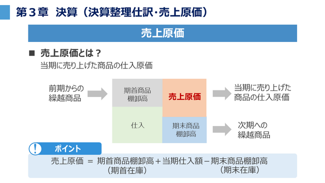 本コースでは日商簿記3級の大問ごとに出題されやすい事項を中心に解説します。「仕訳」「帳簿」「決算」の3部構成とし、重要な仕訳、主要な帳簿の見方や記入方法、仕訳から決算までのフロー、損益計算書や貸借対照表の内容や見方について効率的に学習することが可能です。