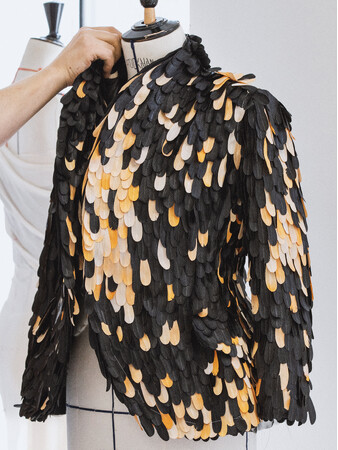 エイミー・マディガンは、ブラックのスパンコールの刺繍が施されたトップスに、シルクのフェザージャケットを羽織り、ウール&シルクのパンツを合わせました。