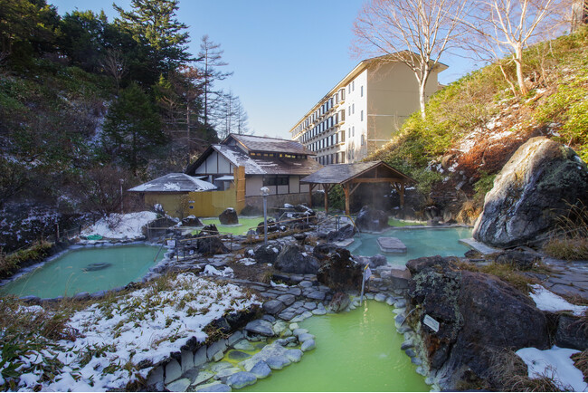 万座高原ホテル(所在地:群馬県嬬恋村万座温泉、総支配人:塚本亨)は冬期休業期間を経て2026年4月4日(土)より営業を再開いたします。春先の穏やかな陽ざしのもと、残雪を纏う山並みを眺めながら露天風呂入浴を楽しむひととき。標高1,800mの高地に位置する万座温泉は、日常の喧騒や花粉の影響から離れた環境にあり、澄んだ空気と雄大な自然に包まれた温泉地です。日本有数の硫黄含有量を誇る「万座の湯」でゆったりと温泉入浴をお楽しみください。