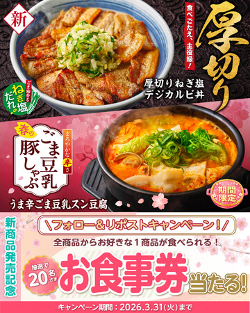 株式会社やる気(本社:京都府京都市/代表取締役:大島幸士)が展開する京都初カルビ丼とスン豆腐の専門店「韓丼」は、2026年3月17日(火)より、春の2大新商品『厚切りねぎ塩デジカルビ丼』『うま辛ごま豆乳スン豆腐』の販売を記念して、韓丼公式Xアカウントにて抽選で20名様に韓丼のお食事券が当たるフォロー&リポストキャンペーンを開催いたします。