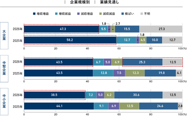 (1)企業規模別の業績見通しについて、2025年度は「増収増益」が最多も、2026年度は慎重な見方が広がる
