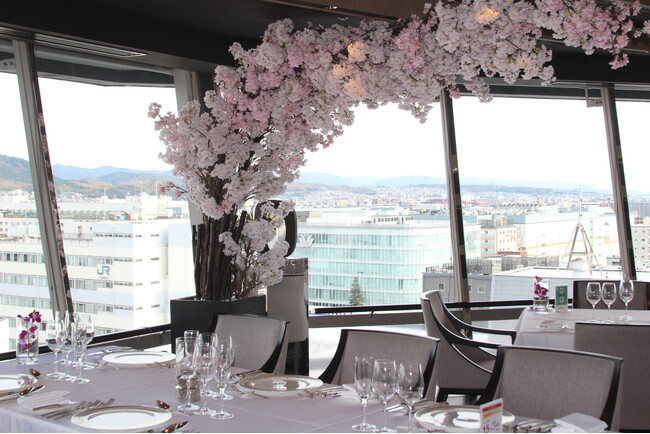 桜が咲き誇る春の京都の風情を館内でも感じていただけるよう、1階ホテルロビーには桜の生花を設え、春の息吹を感じる空間でお迎えします。最上階の回転展望フレンチレストラン「フレンチダイニング トップ オブ キョウト」では、天井まで広がる桜のアーチを見上げながら、ゆるやかに移ろう春の京都の景色とともにフランス料理をご堪能いただけます。また「オールデイダイニング カザ」店頭では、満開の桜を模した華やかなトンネルが登場し、春の雰囲気を演出します。